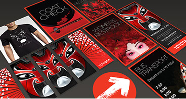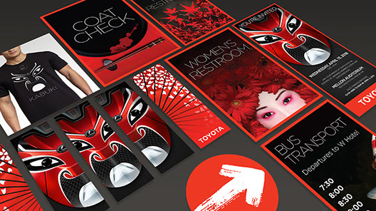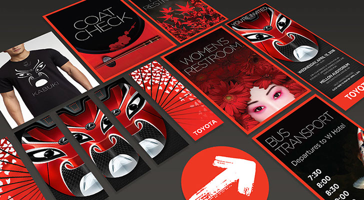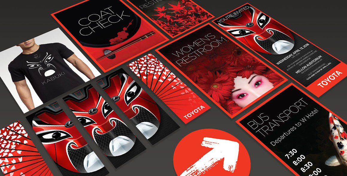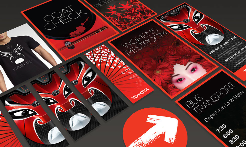 Each year, TOYOTA holds a large gala event near their North American offices in Washington, DC. For the past 3 years, I have partnered with Celadon Event Design to create the many materials needed for the event including invitations (print and digital), event signage, and a wide variety of design and decorative elements. The materials shown were for a kabuki and Japanese themed event and included 25ft tall banners with a custom kabuki mask that I created using photos of Toyota and Lexus automobiles.